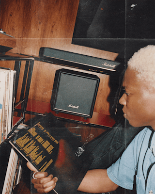 A person with short blonde hair examines a vinyl record sleeve near shelves of records, and a Marshall Heston Sub 200 Black subwoofer.